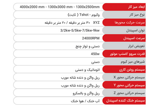 دستگاه به اسپیندل‌هایی با توان‌های مختلف از 3 کیلو وات تا 9 کیلو وات مجهز است. این تنوع توان، باعث انعطاف‌پذیری بیشتر دستگاه در انجام کارهای مختلف می ‌شود. همچنین سرعت اسپیندل به RPM 24000 می‌رسد که عملکرد سریع و مؤثر را تضمین می‌ کند.