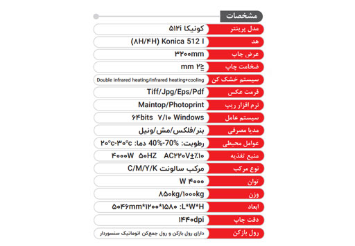 کونیکا i512 با ویژگیهای فنی و ساختاری پیشرفته، یکی از بهترین گزینهها برای کسبوکارهای چاپخانهای و تبلیغاتی محسوب میشود. این ویژگیها عبارتاند از: